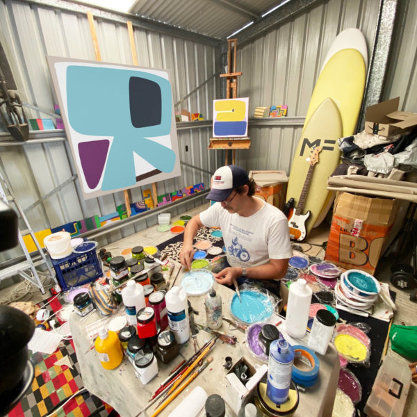 His recent work brings together form and colour with varying quality of edge and flatness of paint. Although the compositions are non-narrative, they are suggestive in their simple, organic forms. Depending on the viewer’s perspective and what they bring to the experience, these paintings can be malleable between what they project out to an audience and what the audience projects onto the painting. In these seemingly simple compositions there is nowhere for the artist to hide. Every colour, tone, shape, intersection, and edge are considered and composed.