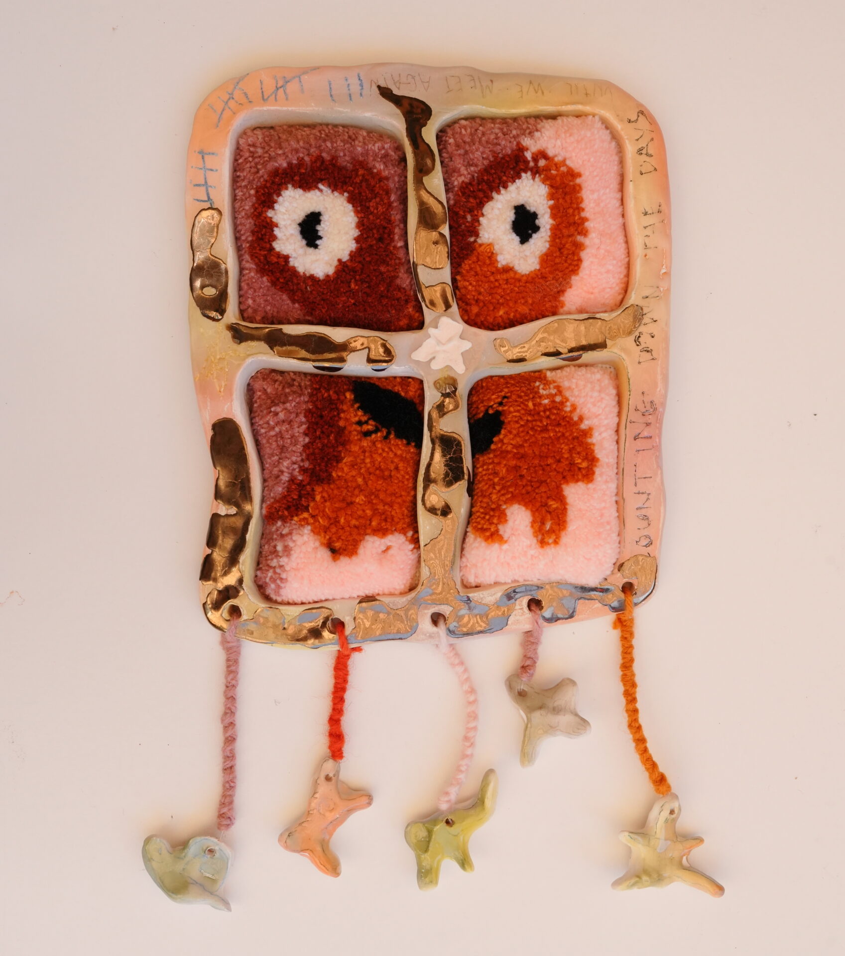Raku clay, earthenware slip, glaze, underglaze crayon, graffito sheets, backing fabric, acrylic and wool yarn, adhesive