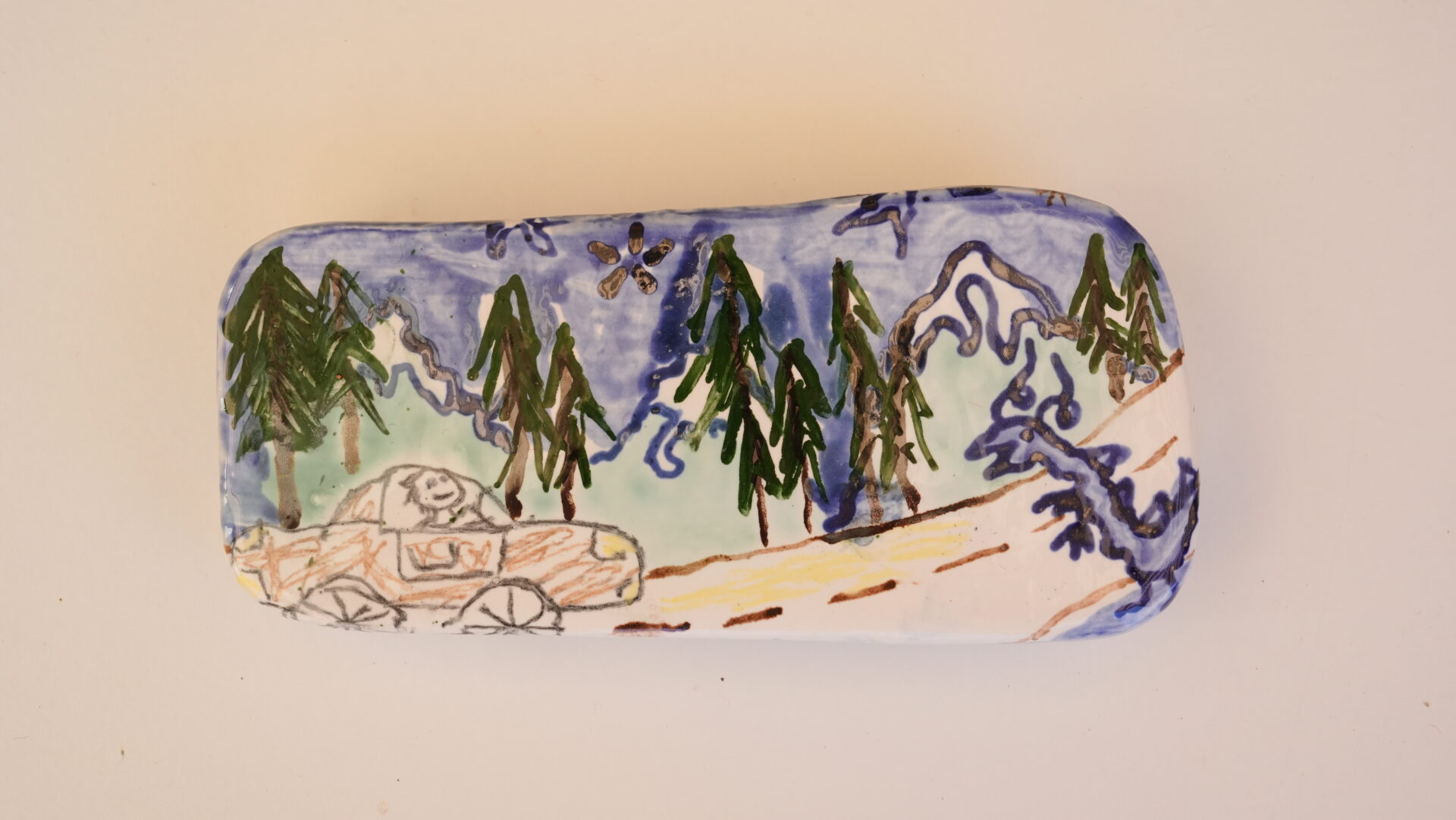 Raku clay, earthenware slip, glaze, underglaze crayons, oxides