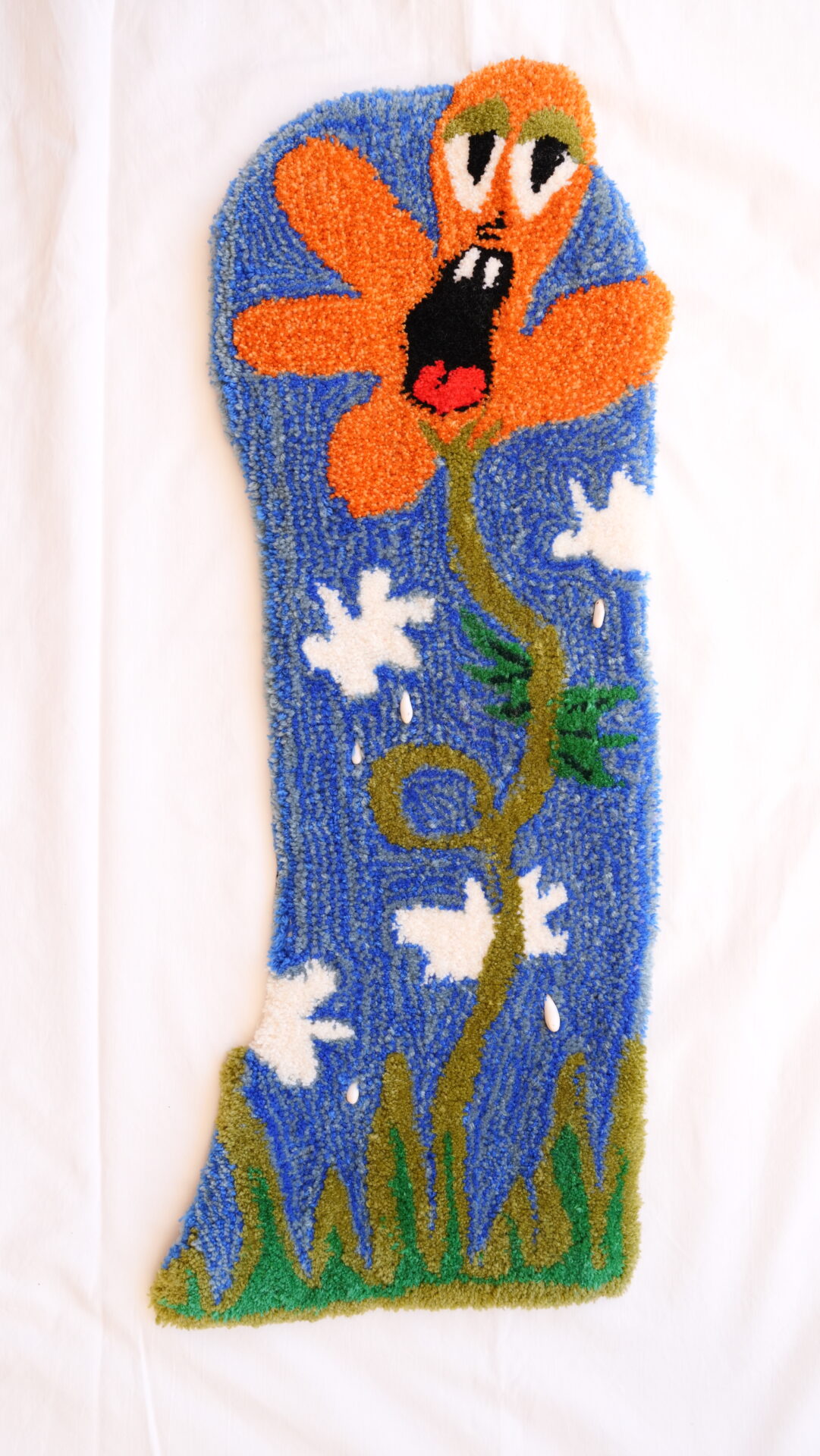 Backing fabric, acrylic and wool yarn, felt, string, raku clay, earthenware slip, glaze, adhesive