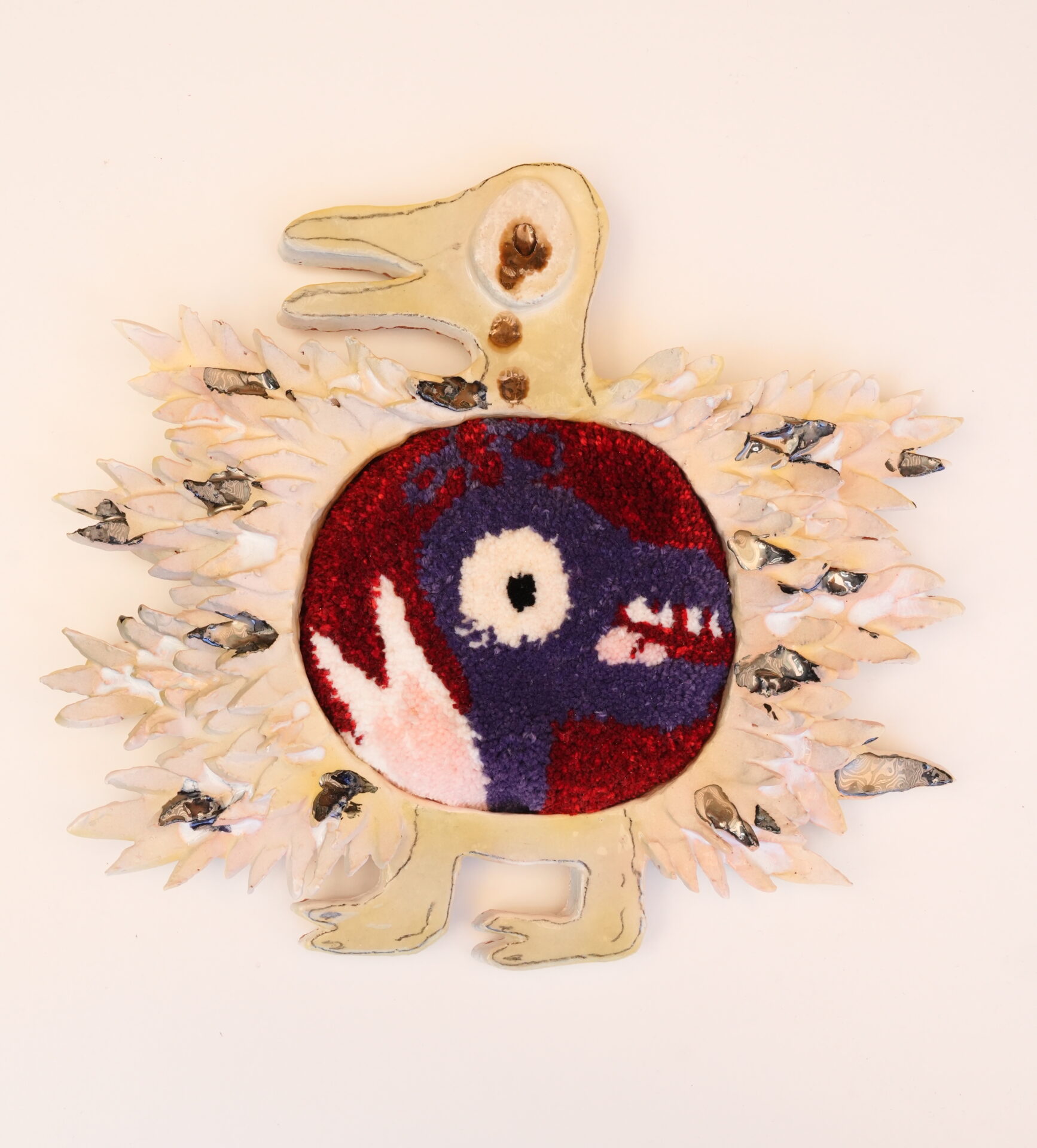 Raku clay, earthenware slip, glaze, underglaze crayon, backing fabric, acrylic and wool yarn, adhesive