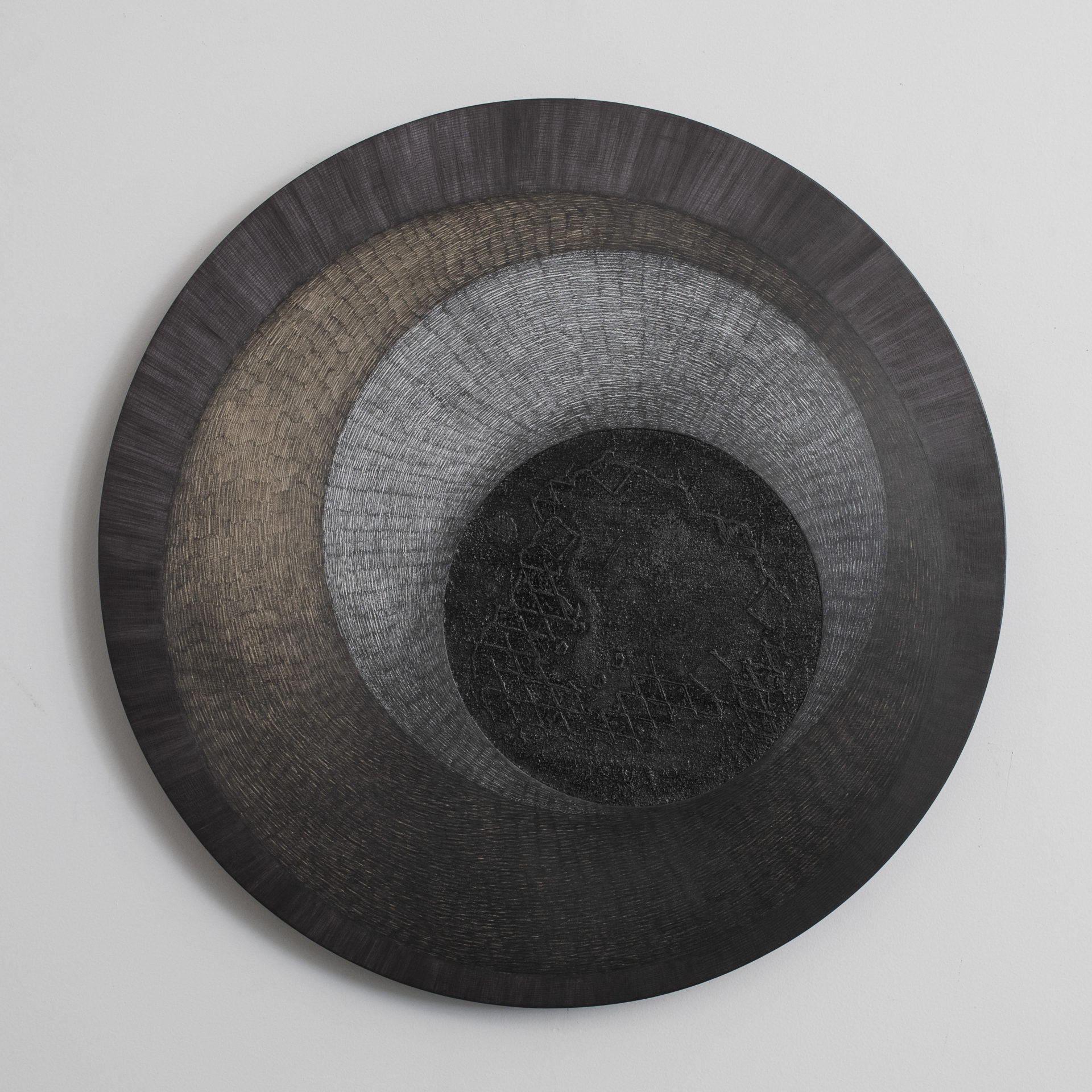 Graphite, laser etch, gesso and pencil on birch wood panel